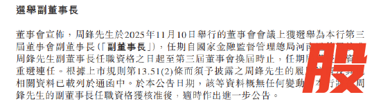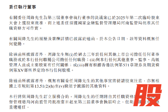 周锋于2025年11月10日举行的董事会会议上获选举为该行第三届董事会副董事长(副董事长),任期自国家金融监督管理总局河南监管局核准周锋副董事长任职资格之日起至第三届董事会换届时止,任期届满后有资格重选连任。