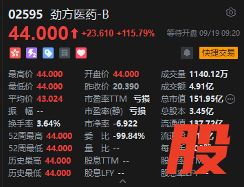 9月19日消息,劲方医药-B今日正式登陆港交所主板。该股早盘大幅高开,报44港元,较发行价20.4港元暴涨115.79%。按每手200股计算,不计手续费,每手账面盈利达4722港元。